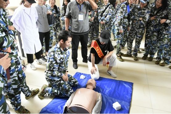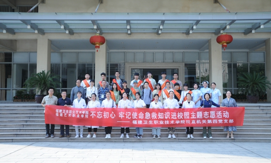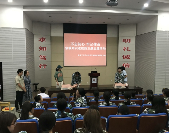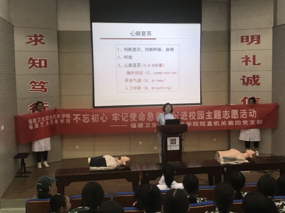 直屬機(jī)關(guān)第四黨支部邀請了我校臨床醫(yī)學(xué)系和護(hù)理系多名資深培訓(xùn)教師,前往福建藝術(shù)職業(yè)學(xué)院授課,他們與獲得培訓(xùn)合格證的醫(yī)學(xué)院學(xué)生志愿者配合演示、分步驟講解,志愿者輔助逐個指導(dǎo),生動形象地教授了海姆立克急救法和心臟驟?;颊叩膯稳送绞中姆螐?fù)蘇。省藝職院1000多名新生分批在模擬人模型上進(jìn)行實(shí)操。