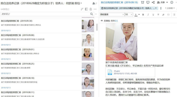 除了項目幫扶,在具體理論學(xué)習(xí)上,該支部也下足了功夫,一是“雙帶頭人”業(yè)務(wù)方面的優(yōu)勢推動著黨建工作的不斷創(chuàng)新?!敖裉鞂n}研討通過線上線下相融合的方式進(jìn)行,我明確了參加同學(xué)會的紀(jì)律以及可能存在的違紀(jì)風(fēng)險,對違反生活紀(jì)律的條款印象深刻,很期待下一次的學(xué)習(xí)?!敝Р奎h員邱麒說。通過信息化的手段實現(xiàn)充分研討,參與度高,互動性好;通過剖析貼近黨員實際生活的案例以加深黨員對理論知識的理解,既接地氣,也有效果。這是支部開展黨員教育創(chuàng)新的一種模式,旨在解決黨內(nèi)理論學(xué)習(xí)、研討枯燥乏味的不足。二是“雙帶頭人”業(yè)務(wù)方面的信息化優(yōu)勢同樣用于黨員培養(yǎng)。“現(xiàn)在跟培養(yǎng)人匯報思想容易多了,打開平臺,語音匯報,微信通知培養(yǎng)老師就行了?!?8藥學(xué)303班的陳白潔同學(xué)說。支部建立了信息化匯報的平臺,為每位培養(yǎng)對象分配空間,培養(yǎng)對象定期通過語音匯報學(xué)習(xí)生活與思想成長情況,完成后用微信通知培養(yǎng)人登錄平臺查閱并予以答復(fù)。這項舉措既解決了過去培養(yǎng)人與培養(yǎng)對象之間因為時間、空間等局限導(dǎo)致溝通不暢的問題,又在培養(yǎng)過程中形成一套培養(yǎng)記錄?!爸瘯ㄆ跈z查培養(yǎng)記錄,發(fā)現(xiàn)培養(yǎng)對象未及時匯報或培養(yǎng)人未及時回復(fù),我們會及時聯(lián)系培養(yǎng)人,這也是監(jiān)督、教育黨員的一種形式?!敝Р啃麄魑瘑T黃艷說。通過設(shè)置權(quán)限,支部委員可以隨時查看培養(yǎng)記錄,從而監(jiān)督黨員培養(yǎng)的過程,進(jìn)而提升黨員培養(yǎng)的質(zhì)量。