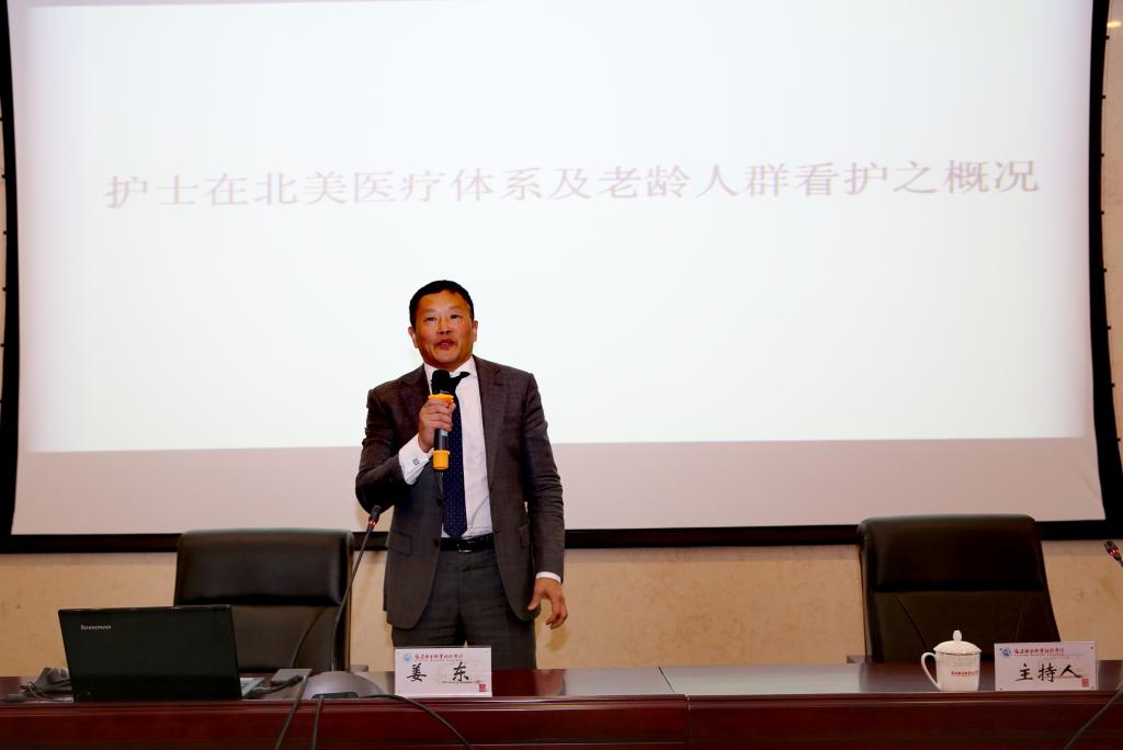 11月22日下午,加拿大資深注冊(cè)護(hù)士姜東教授應(yīng)邀來(lái)我校做《護(hù)士在北美醫(yī)療體系及老齡人群看護(hù)之概況》專題講座。師生代表共220余人到場(chǎng)聆聽(tīng),講座由鄭翠紅副院長(zhǎng)主持。