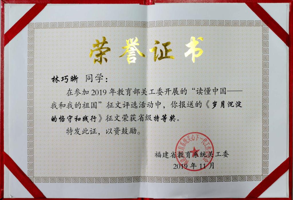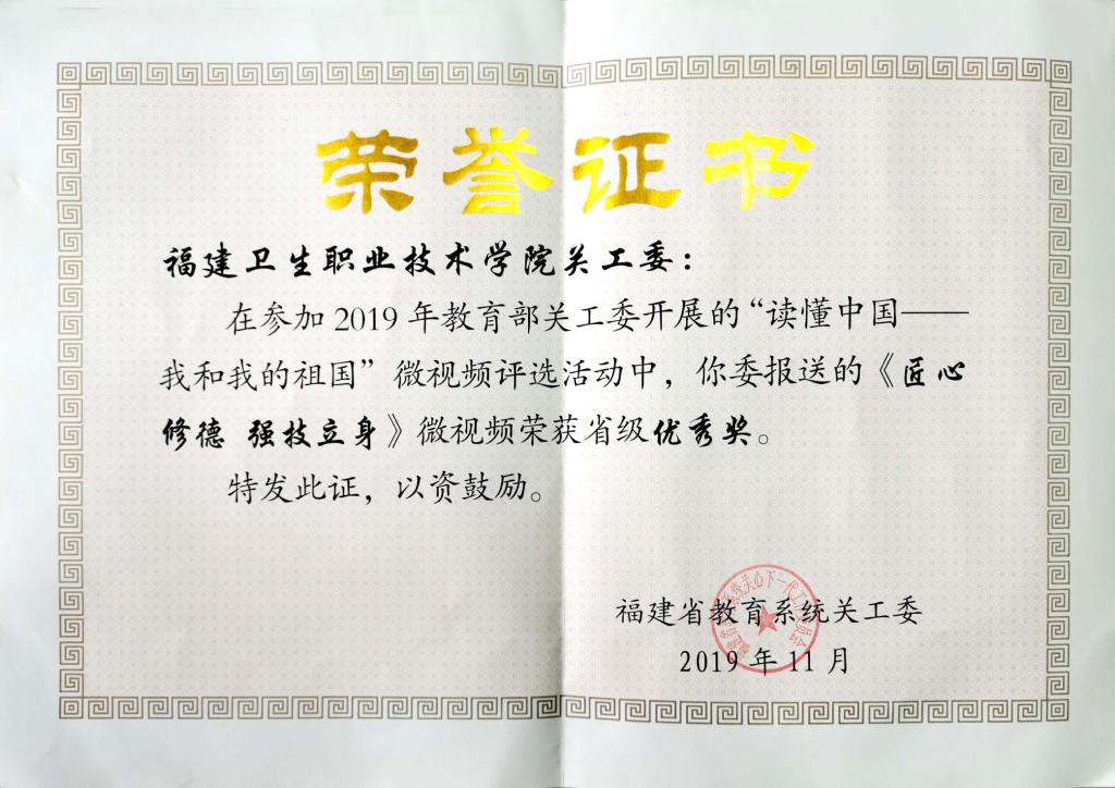 我校關工委高度重視并組織部署相關工作,擇優(yōu)報送作品。經省教育系統(tǒng)關工委統(tǒng)一組織評選,和全省本科、高職院校并驅爭先。最終,由學工處指導、醫(yī)技系林巧晰同學撰寫的征文《歲月沉淀的恪守和踐行》榮獲省級特等獎;由護理系關工委劉珍紅老師參與制作的微視頻《匠心修德 強技立身》榮獲省級優(yōu)秀獎。我校關工委將利用獲獎征文和微視頻寶貴資源,讓全院青年學生,從中受到更多教育和感悟。