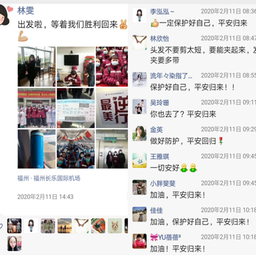 她們雖不同在一個地方,每天戰(zhàn)“疫”歸來,卻不忘互相問候,互相打氣,因?yàn)樗齻兌济靼走@是一場無硝煙的戰(zhàn)“疫”,必將不負(fù)眾望,平安歸來!