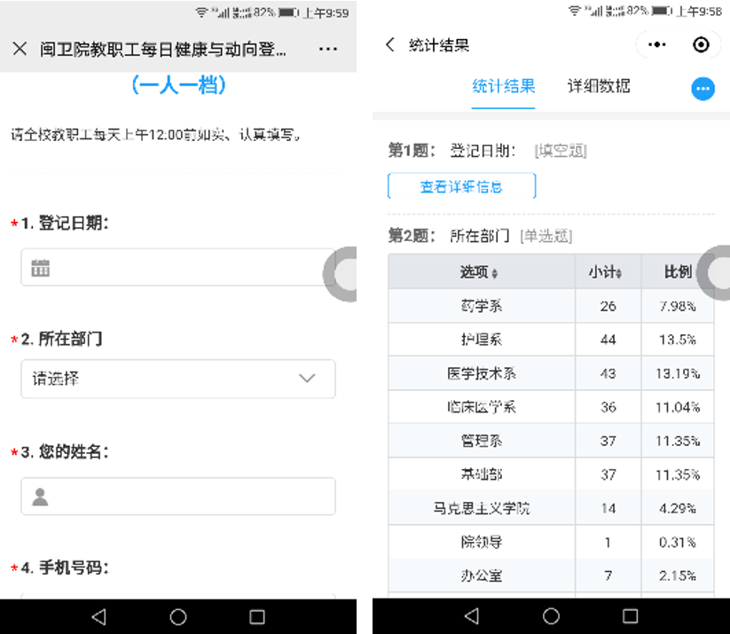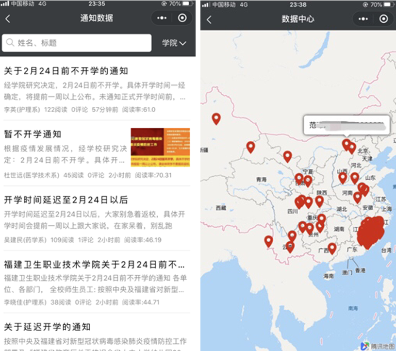針對(duì)疫情防控形勢(shì)下,師生各口徑均有數(shù)據(jù)報(bào)送需求,日打卡、微信接龍等“初級(jí)信息化”方式,效果不理想?,F(xiàn)代教育技術(shù)中心經(jīng)多方對(duì)比、查詢,幫助人事處選擇市面上成熟的 “問卷星”完成教師個(gè)人報(bào)告體溫、返榕,疫源接觸等內(nèi)容快速填報(bào),實(shí)現(xiàn)數(shù)據(jù)匯總、歸類,并能點(diǎn)對(duì)點(diǎn)通知未完成人員。一通百通,人事處借助此平臺(tái)推出系列報(bào)表,涵蓋在職、退休、外聘任等人員群體。幫助學(xué)生工作處選用了微信小程序“我在校園”進(jìn)行數(shù)據(jù)信息化報(bào)送,使學(xué)生管理部門可以即時(shí)獲取通知送達(dá)情況,清晰獲得學(xué)生簽到時(shí)所處的位置,更好地為學(xué)生的健康安全保駕護(hù)航。