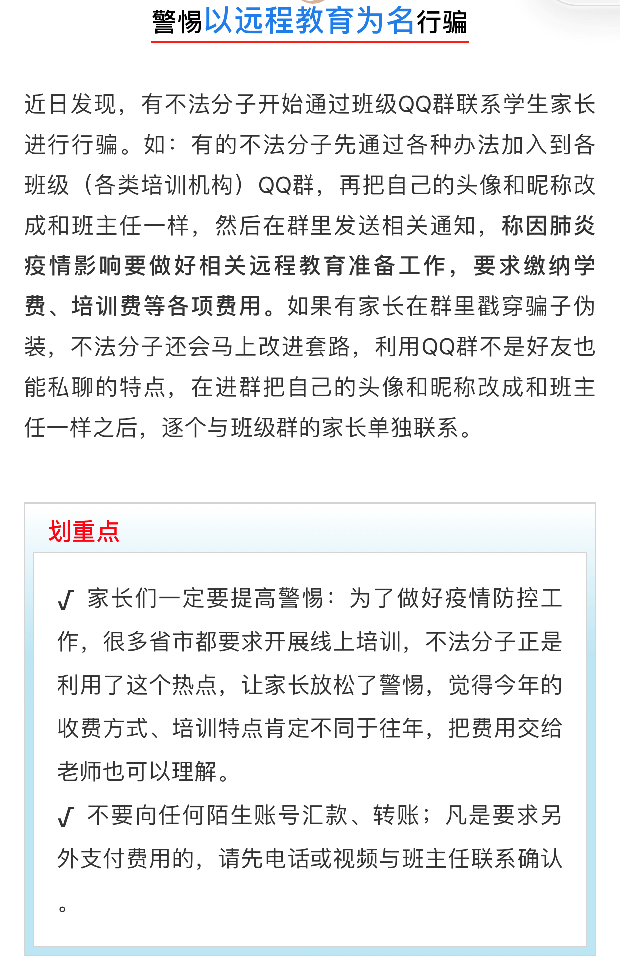 針對以上花樣繁多的騙局,為增強(qiáng)學(xué)生的防范意識,學(xué)工處組織輔導(dǎo)員召開專題防詐騙主題班會,一是轉(zhuǎn)發(fā)教育部網(wǎng)站發(fā)布的《全國治理教育亂收費聯(lián)席會議辦公室關(guān)于謹(jǐn)防有人利用疫情防控期間線上教學(xué)名義進(jìn)行網(wǎng)上收費詐騙的預(yù)警(2020年第1號預(yù)警)》到各班級群,落實學(xué)生查看學(xué)習(xí)。二是提醒學(xué)生謹(jǐn)防各種詐騙手段,強(qiáng)調(diào)現(xiàn)有學(xué)校網(wǎng)絡(luò)課程均為免費,若遇網(wǎng)絡(luò)信息有疑惑,應(yīng)馬上電話輔導(dǎo)員進(jìn)行確認(rèn),不要盲目相信。三是再次提醒學(xué)生,目前各類騙術(shù)仍在不斷迭代升級,同學(xué)們應(yīng)提高安全防范意識,只要不輕信、不貪心,任何時候都能遠(yuǎn)離詐騙!