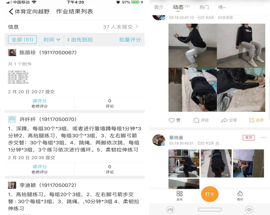 面對(duì)“隔空”教學(xué),體育教研室教師及時(shí)推出了運(yùn)動(dòng)“打卡”,確保學(xué)生宅家也能動(dòng)起來(lái)。