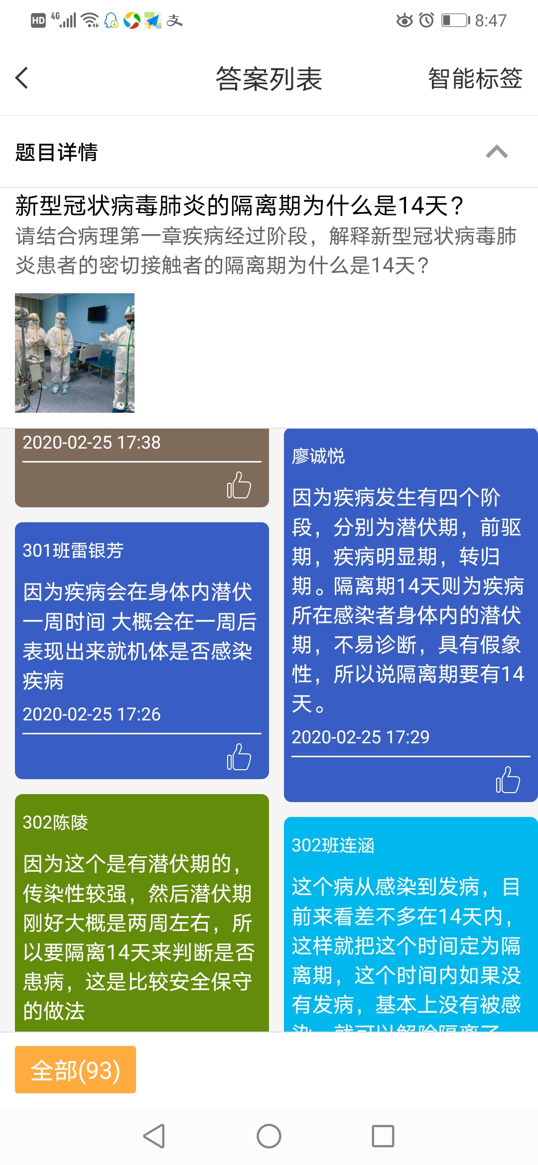 病理教研室的黨員教師在病理學(xué)課程教學(xué)中,針對(duì)知識(shí)點(diǎn)疾病的經(jīng)過(guò)“潛伏期”,引導(dǎo)學(xué)生思考新冠肺炎為什么要有隔離期?通過(guò)討論使學(xué)生明白:新冠肺炎有潛伏期,人群中處于潛伏期的人極易成為感染源,這也是為什么國(guó)家號(hào)召大家不出門(mén),這既是保護(hù)自己也是保護(hù)他人。通過(guò)學(xué)習(xí),讓學(xué)生知其然,知其所以然。