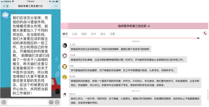 由于受疫情影響,學校無法按時開學,線上教學成為了此次黨員教師戰(zhàn)“疫”的重要內容。作為樣板黨支部,臨床醫(yī)學系第三黨支部要求黨員教師先學一步,提升線上教學技能,力所能及地幫助教研室里的非黨員教師。黨員教師并沒有止步于“停課不停學”,大家更注重“停課不停育”。疫情是最好的教材,在這場戰(zhàn)“疫”中,無數(shù)的白衣天使、科研人員構筑了防控疫情的堅強防線,讓我們深刻的感受到“逆行者”的勇敢。拔地而起的“火神山”、“雷神山”醫(yī)院,展現(xiàn)了中國速度,也展現(xiàn)了團結的力量。一批批物資、款項從四面八方匯聚,舉國上下同舟共濟,共同戰(zhàn)“疫”。將這些例子在講授專業(yè)知識的同時自然地融入,實現(xiàn)“課程思政”育人目標,在課堂中塑造正確的價值觀,幫助學生樹立信心,堅定理想,振興祖國。例如支部副書記張?zhí)N老師,在講授中融入了新冠肺炎,告訴同學們養(yǎng)“肺”刻不容緩,同時也提到要幫助他人,關愛他人的仁愛理念,取得了良好的授課效果。