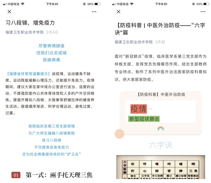 自疫情發(fā)生以來,支部黨員教師結合專業(yè)特點,充分發(fā)揮專業(yè)優(yōu)勢,利用公眾號、QQ、微信等渠道宣傳新冠肺炎的各類防護知識。支部黨員教師大多是中醫(yī)類專業(yè),他們在專業(yè)建設任務繁重的情況下,利用晚上休息的時間制作了“八段錦”、“中藥外治”、“穴位按摩”、“六字訣”、“小兒保健”等一系列中醫(yī)外治法防疫科普文章,為全院師生提供了簡便易操作的居家防疫方法。