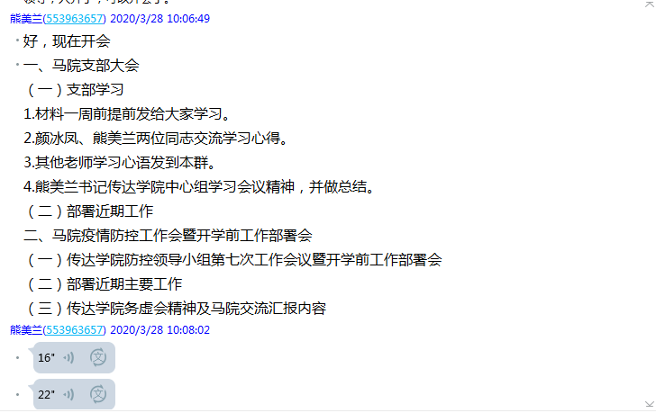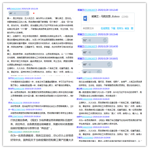 2020年3月28日上午,直屬馬克思主義學院黨支部召開線上黨員大會,集中學習《新時代高等學校思想政治理論課教師隊伍建設(shè)規(guī)定》《教育部有關(guān)部門負責人就<新時代高等學校思想政治理論課教師隊伍建設(shè)規(guī)定>答問》等6份文件。會議由黨支部書記熊美蘭主持,全體教師黨員參加了會議。教師們在會議上暢談心得和感想,掀起學習討論熱潮。