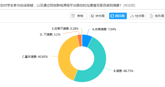 教師對學(xué)生參與在線答疑,以及通過班級群或課程平臺與老師的溝通滿意率達96.62%。