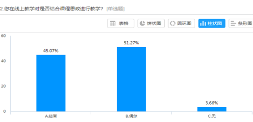 在線授課過程中老師講課的節(jié)奏也形式多樣,有的依據(jù)時間和內(nèi)容,有的依據(jù)教材的難易程度,有的依據(jù)學(xué)生的互動情況,多講解多演示,較好地完成了在線教學(xué)授課任務(wù)。在線上教學(xué)同時,96.34%的老師還結(jié)合課程思政進行教學(xué),全方位育人效果顯著。