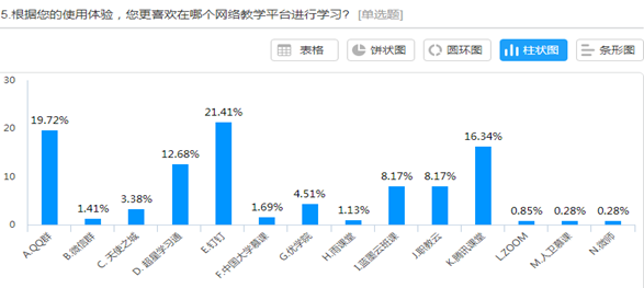 疫情期間,每位老師都是第一次上線當(dāng)主播,面對新生事物,線上授課無疑提高了對教師課堂把控力、信息化技能等多方面的要求。老師們根據(jù)自己的使用體驗,反復(fù)對比,選擇出自己更喜歡的網(wǎng)絡(luò)教學(xué)平臺,目前使用較多排名前四的平臺有:釘釘、QQ群、騰訊課堂、超星學(xué)習(xí)通。此項調(diào)查,也為今后學(xué)院教學(xué)改革發(fā)展提供方向。與此同時,教務(wù)處將調(diào)查統(tǒng)計結(jié)果反饋各教學(xué)部門,便于老師們及時調(diào)整教學(xué)策略和調(diào)換教學(xué)平臺。