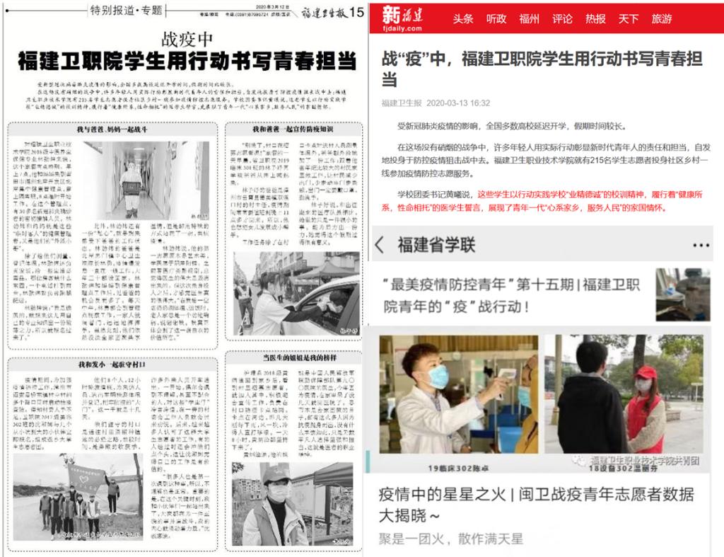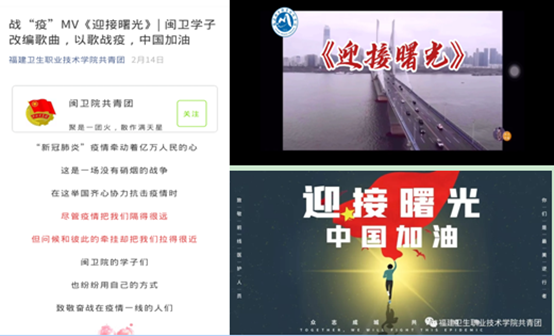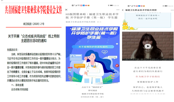 開展“眾志成城·共同戰(zhàn)疫”主題活動(dòng)。團(tuán)委發(fā)表倡議書,廣泛呼吁同學(xué)們勤洗手、戴口罩、聽從學(xué)院部署、不提前返校。以師生喜聞樂(lè)見的方式制作推送《福建衛(wèi)生職業(yè)技術(shù)學(xué)院師生員工的開學(xué)防護(hù)手冊(cè)》圖文、H5、視頻等版本。組織學(xué)生團(tuán)學(xué)干部編唱《迎接曙光》勵(lì)志歌曲、發(fā)起《武漢,祖國(guó)給予你的關(guān)愛沒(méi)有被隔離》線上云朗誦。結(jié)合抗疫故事,組織各團(tuán)支部學(xué)習(xí)黨的十九屆四中全會(huì)精神,彰顯中國(guó)特色社會(huì)主義制度優(yōu)勢(shì),學(xué)習(xí)宣傳無(wú)私奉獻(xiàn)的“抗疫”精神,尤其是校友遠(yuǎn)赴湖北戰(zhàn)疫的感人事跡、新聞在微博上投稿參與省學(xué)聯(lián)#八閩青心共戰(zhàn)役#微博話題討論,抒發(fā)了閩衛(wèi)院學(xué)子的守家愛國(guó)之情。
