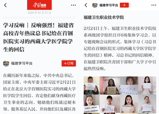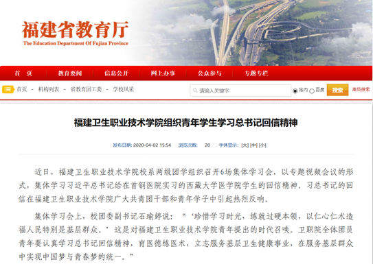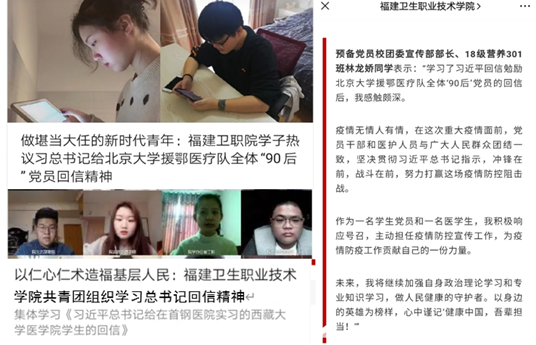 組織學(xué)習(xí)習(xí)近平總書記兩個(gè)回信精神。團(tuán)委第一時(shí)間組織團(tuán)員青年以專題視頻會(huì)議、團(tuán)課等形式學(xué)習(xí)《習(xí)近平總書記給在首鋼醫(yī)院實(shí)習(xí)的西藏大學(xué)醫(yī)學(xué)院學(xué)生的回信》《習(xí)近平總書記給北京大學(xué)援鄂醫(yī)療隊(duì)全體“90后”黨員回信》,編發(fā)《以仁心仁術(shù)造福基層人民:福建衛(wèi)生職業(yè)技術(shù)學(xué)院共青團(tuán)組織學(xué)習(xí)近平總書記回信精神》《做堪當(dāng)大任的新時(shí)代青年:福建衛(wèi)職院學(xué)子熱議習(xí)近平總書記給北京大學(xué)援鄂醫(yī)療隊(duì)全體“90后”黨員回信精神》,回信精神在青年學(xué)子中引起熱烈反響,活動(dòng)情況被學(xué)習(xí)強(qiáng)國(guó)、福建省教育廳、學(xué)校共青團(tuán)、福建省學(xué)聯(lián)等官方媒體刊發(fā)。