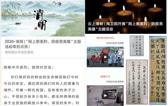 開展“網(wǎng)上祭英烈,防疫思英雄”主題活動(dòng)。各團(tuán)支部組織參與4月4日全國(guó)性哀悼活動(dòng),制作主題團(tuán)課課件、微視頻、詩(shī)歌、繪畫、手抄報(bào)等形式開展主題教育和線上成果展示活動(dòng),并組織同學(xué)們通過(guò)中華英烈網(wǎng)參加由國(guó)家退役軍人事務(wù)部主辦的“致敬2020清明祭英烈”網(wǎng)上祭英烈主題活動(dòng),向英烈、故人送上“云端的思念”,不斷弘揚(yáng)民族精神,唱響愛國(guó)主義主旋律。