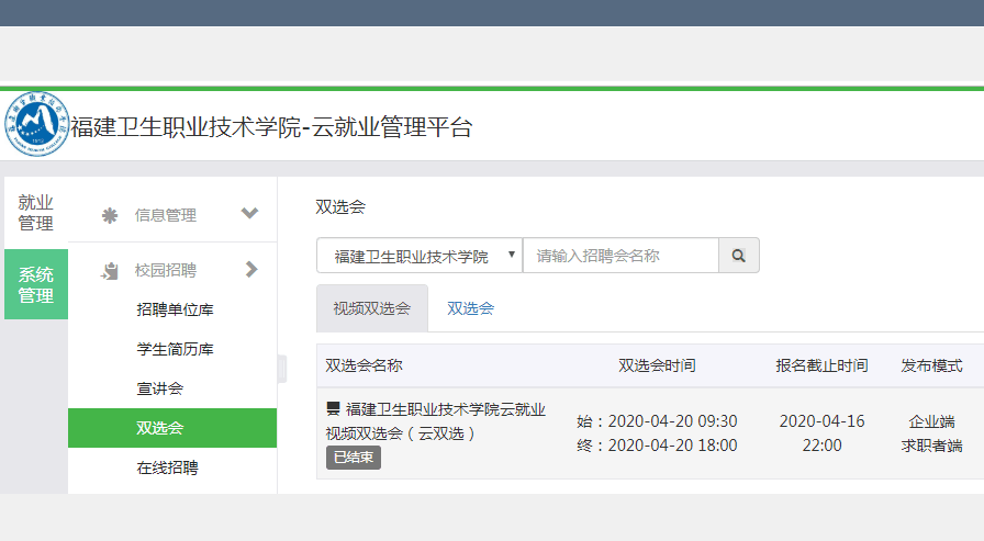 為做好疫情影響下的2020屆畢業(yè)生的就業(yè)服務(wù)工作,落實(shí)“服務(wù)不斷線,就業(yè)不停歇”的工作要求,4月20日,福建衛(wèi)生職業(yè)技術(shù)學(xué)院2020屆畢業(yè)生云就業(yè)視頻專(zhuān)場(chǎng)雙選招聘會(huì)順利舉辦,全力保障畢業(yè)生求職的需求。