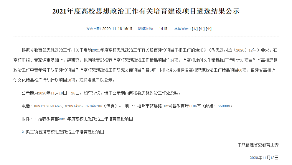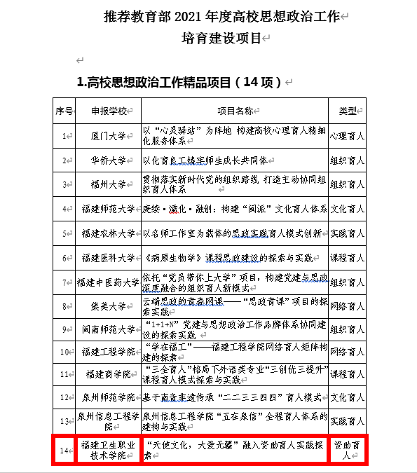 近日,中共福建省委教育工委2021年度高校思想政治工作有關(guān)培育建設(shè)項目公布了公示名單,我校學(xué)生工作部資助管理中心申報的“‘天使文化,大愛無疆’融入資助育人實踐探索”項目,擬立項省級高校思想政冶工作培育建設(shè)項目,并且擬作為我省“高校思想政冶工作精品項目”向教育部推薦。特別值得一提的是:我省擬向教育部推薦的精品項目共14項,其中13項均為本科院校項目,我校學(xué)生工作部申報的項目,是唯一一所高職院校項目。