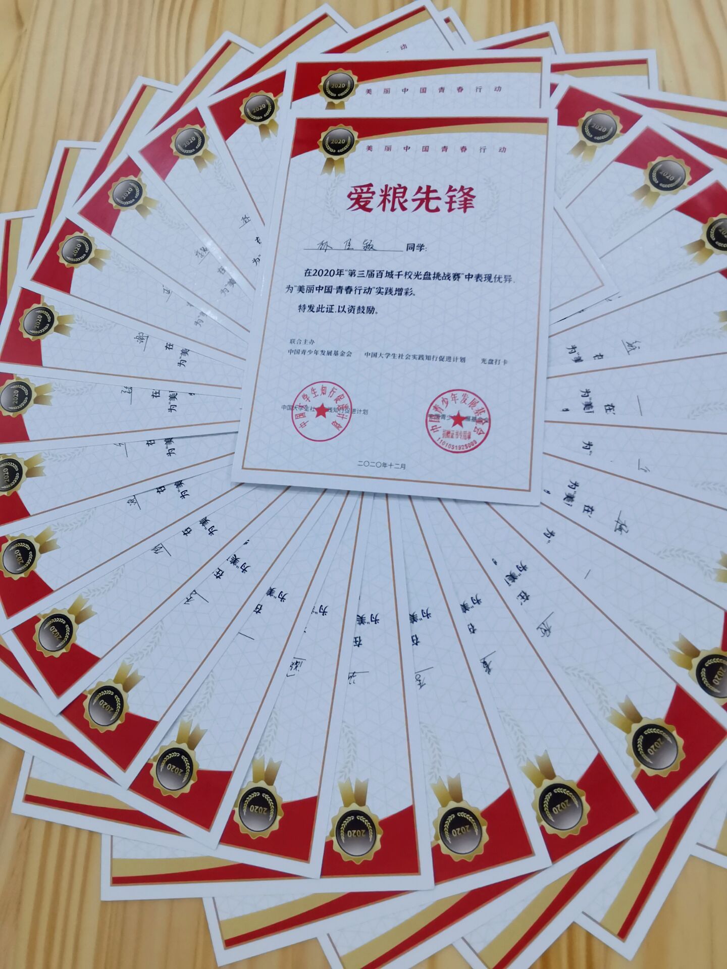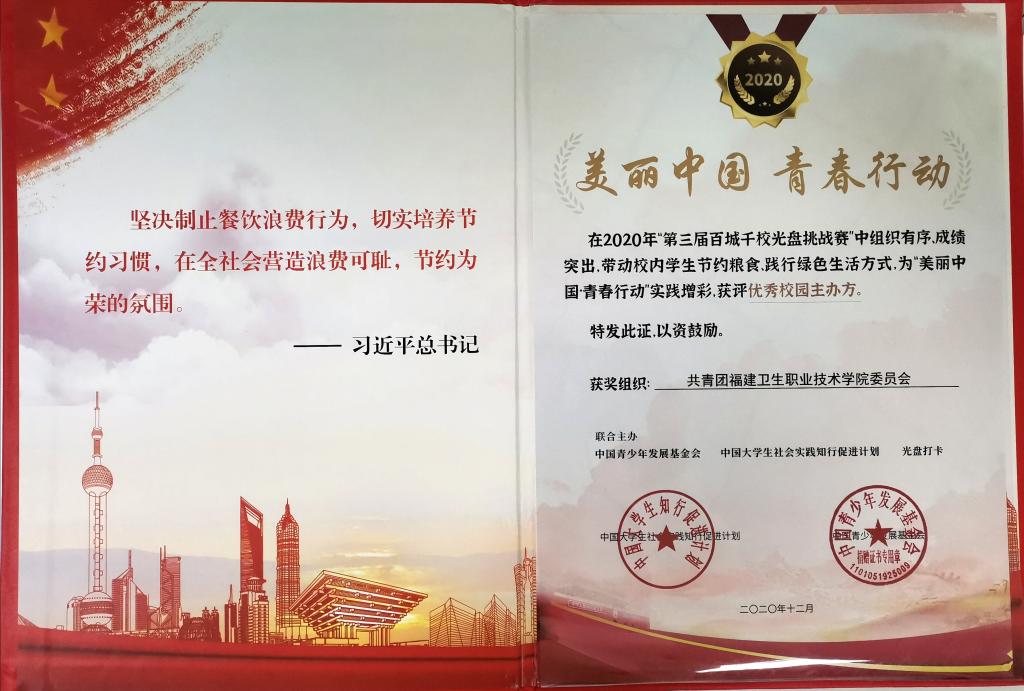 為貫徹落實習近平總書記有關重要指示精神,帶領廣大青年厲行節(jié)儉、弘揚正能量,配合全國青聯(lián)光盤打卡公益工作,堅決制止餐飲浪費行為,切實培養(yǎng)節(jié)約習慣,在全社會營造浪費可恥、節(jié)約為榮的氛圍,我校團委帶動校內學生節(jié)約糧食,踐行綠色生活方式,為“美麗中國·青春行動”實踐增彩,我校在此次挑戰(zhàn)賽中榮獲全國第42名,福建賽區(qū)第1名的好成績,并榮獲“優(yōu)秀校園主辦方”榮譽稱號。