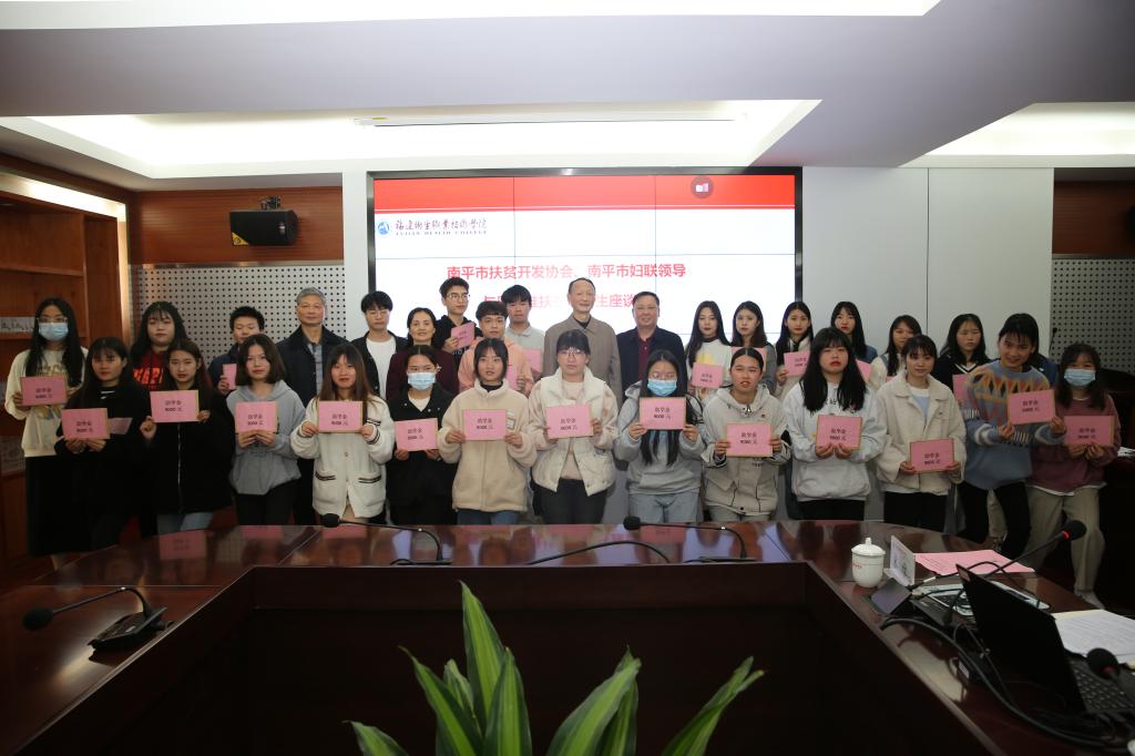 12月28日下午,南平市扶貧開(kāi)發(fā)協(xié)會(huì)會(huì)長(zhǎng)柳貴清、南平市婦聯(lián)副主席黃萍等一行5人蒞臨我校,看望、慰問(wèn)原“中職護(hù)理專業(yè)精準(zhǔn)技術(shù)扶貧班”升入我校高職的27名同學(xué),并與他們座談。校黨委書(shū)記曾武祈、副院長(zhǎng)黃銘珊參加了會(huì)議,學(xué)生工作部、護(hù)理學(xué)院、藥學(xué)院、醫(yī)學(xué)技術(shù)系、健康管理系負(fù)責(zé)人、有關(guān)班級(jí)輔導(dǎo)員一同參會(huì)。座談會(huì)由學(xué)工部部長(zhǎng)宋維主持。