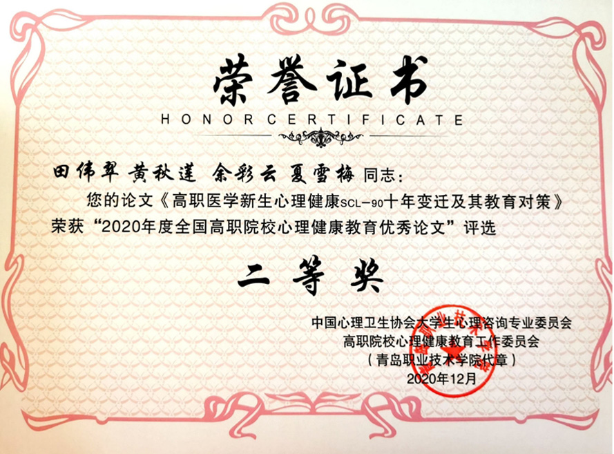 2020年12月18日,接中國心理衛(wèi)生協(xié)會大學(xué)生心理咨詢專業(yè)委員會高職院校心理健康教育工作委員會下發(fā)的全國高職心教(2020)4號文件,健康管理系教師田偉翠、黃秋蓮、余彩云和夏雪梅撰寫的論文《高職醫(yī)學(xué)新生心理健康SCL-90十年變遷及其教育對策》榮獲“2020年度全國高職院校心理健康教育優(yōu)秀論文”二等獎。