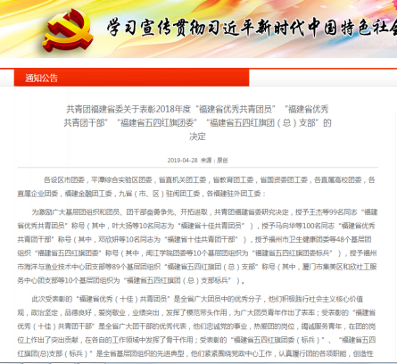 為激勵廣大基層團(tuán)組織和團(tuán)員、團(tuán)干部奮勇爭先、開拓進(jìn)取,近日,共青團(tuán)福建省委研究決定,對團(tuán)的各條戰(zhàn)線的優(yōu)秀團(tuán)員、團(tuán)干部和先進(jìn)基層團(tuán)組織等行了表彰。