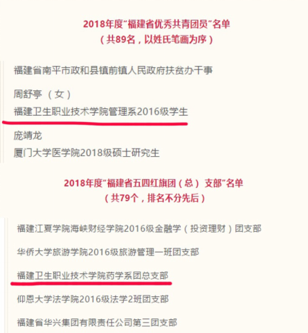 我院管理系2016級學(xué)生周舒亭獲2018年度“福建省優(yōu)秀共青團(tuán)員”稱號,藥學(xué)系團(tuán)總支獲2018年度“福建省五四紅旗團(tuán)(總) 支部”稱號。