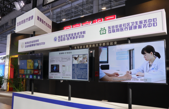 ↑7號館國家衛(wèi)健委展區(qū),福建衛(wèi)生職業(yè)技術學院的互聯(lián)網+醫(yī)養(yǎng)康護平臺位列其中