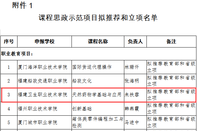 近日,福建省教育廳公布了2021年職業(yè)教育和繼續(xù)教育課程思政示范項(xiàng)目擬推薦和立項(xiàng)名單,我校教務(wù)處處長(zhǎng)朱扶蓉教授主持申報(bào)的《天然藥物學(xué)基礎(chǔ)與應(yīng)用》獲批擬省級(jí)立項(xiàng)并推薦教育部參評(píng)國(guó)家課程思政示范項(xiàng)目、護(hù)理學(xué)院洪霞教授主持申報(bào)的《健康評(píng)估》獲批省級(jí)立項(xiàng)。這一榮譽(yù)體現(xiàn)了我校切實(shí)貫徹落實(shí)立德樹(shù)人根本任務(wù)要求,是我校課程思政教學(xué)改革工作取得新突破的重要標(biāo)志,這將帶動(dòng)我校專(zhuān)業(yè)教師深化課程思政改革,助力構(gòu)建學(xué)?!叭恕毙赂窬帧?/p>