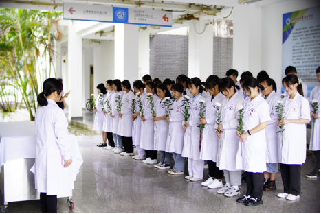 參加活動的師生集體行默哀禮,感恩無言良師,隨后大家向大體老師鞠躬并敬獻鮮花,表達敬意與追思。