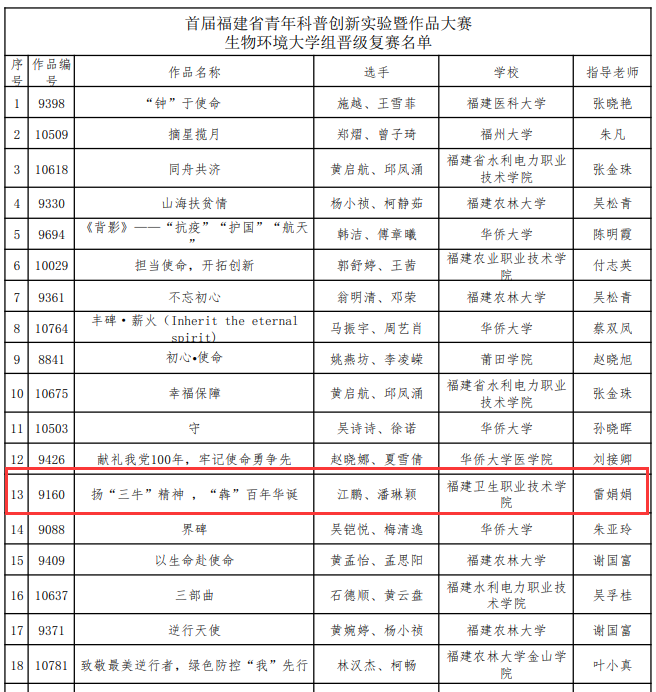 經(jīng)過激烈的角逐,我校醫(yī)學(xué)技術(shù)系18檢驗(yàn)302班江鵬、18檢驗(yàn)303班潘琳穎兩位同學(xué)在雷娟娟老師指導(dǎo)下創(chuàng)作的《揚(yáng)“三牛”精神,行“醫(yī)者”使命,“犇”百年華誕》作品獲生物環(huán)境(大學(xué)組)福建省三等獎,通過該作品慶祝中國共產(chǎn)黨成立100周年生日。百年征程波瀾壯闊,百年初心歷久彌堅(jiān)。作為在祖國發(fā)展中成長的青年一代,應(yīng)時刻保持銳意進(jìn)取、拼搏奮斗的“三?!本?,將個人的理想志愿同國家的前途、民族的命運(yùn)相結(jié)合,將個人的信念追求同社會的需要和人民的利益相一致,為實(shí)現(xiàn)中華民族偉大復(fù)興貢獻(xiàn)自己的一份力量。