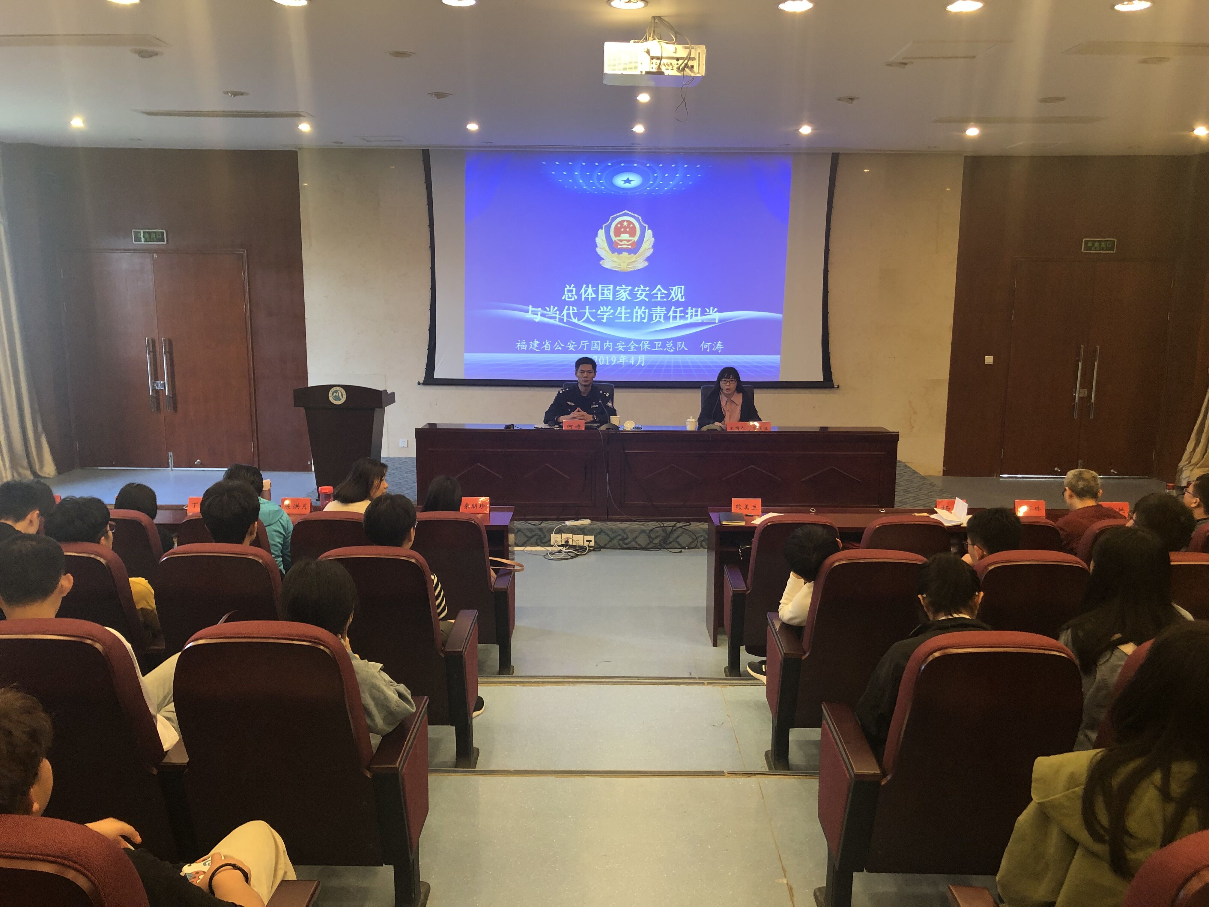 為深入學(xué)習(xí)貫徹習(xí)近平新時代中國特色社會主義思想,堅持總體國家安全觀,著力防范化解重大風(fēng)險,結(jié)合福建衛(wèi)生職業(yè)技術(shù)學(xué)院4·15國家安全日教育系列活動要求,4月18日下午,福建省公安廳一級警長何濤受邀在我院實訓(xùn)樓四樓報告廳為廣大師生開設(shè)題為《總體國家安全觀與當(dāng)代大學(xué)生的責(zé)任擔(dān)當(dāng)》的專題講座。講座由馬克思主義學(xué)院院長熊美蘭主持,思想政治理論課教師,習(xí)近平新時代中國特色社會主義思想讀書社、時代先鋒協(xié)會等馬克思主義理論學(xué)生社團成員,校輿情引導(dǎo)隊和藥學(xué)系等學(xué)生代表等共230多人參加了此次講座。