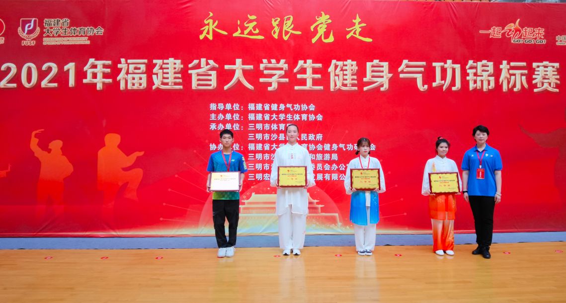 2021年6月4日至7日,慶祝中國共產(chǎn)黨成立100周年2021年福建省大學生健身氣功錦標賽在沙縣區(qū)人民體育公園舉行。我校健身氣功隊的6名隊員獲得兩金、兩銀、兩銅,一項第五名的好成績。