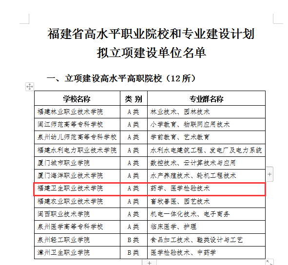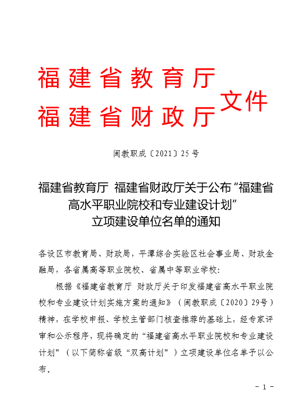 6月24日,省教育廳、財政廳公布“福建省高水平職業(yè)院校和專業(yè)建設(shè)計劃”立項建設(shè)單位名單,我校入選A類高水平高職院校立項建設(shè)單位。