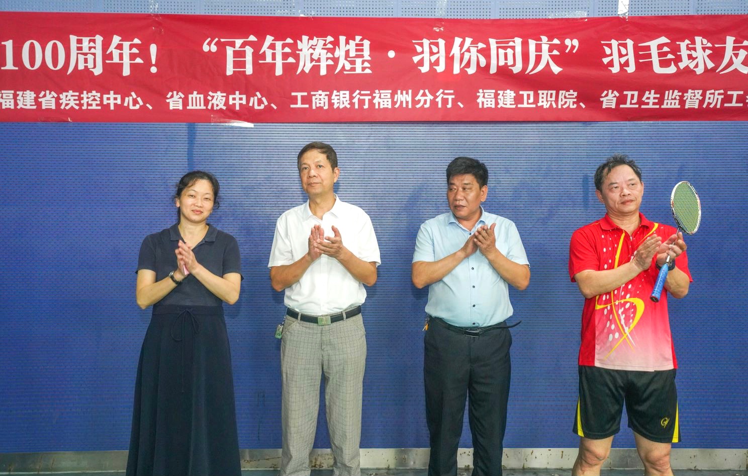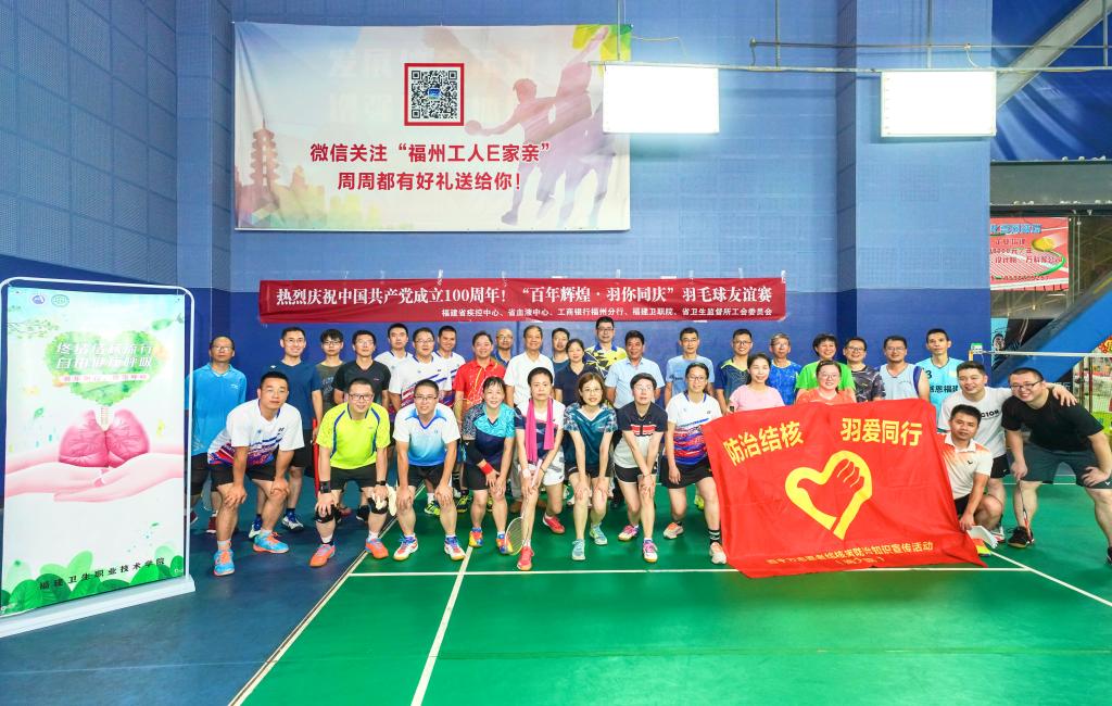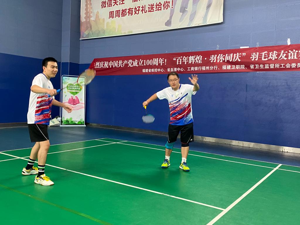 由我校工會與福建省疾病預(yù)防控制中心、福建省血液中心、中國工商銀行福州分行、福建省衛(wèi)生健康監(jiān)督所聯(lián)合舉辦慶祝中國共產(chǎn)黨成立100周年“百年輝煌·羽你同慶”羽毛球友誼賽于6月29日晚在福州市工人文化館羽毛球館開幕。福建省血液中心王明主任、我校工會洪常青副主席和工商銀行福州分行紀(jì)委書記、工委林豐主任先后致辭。
