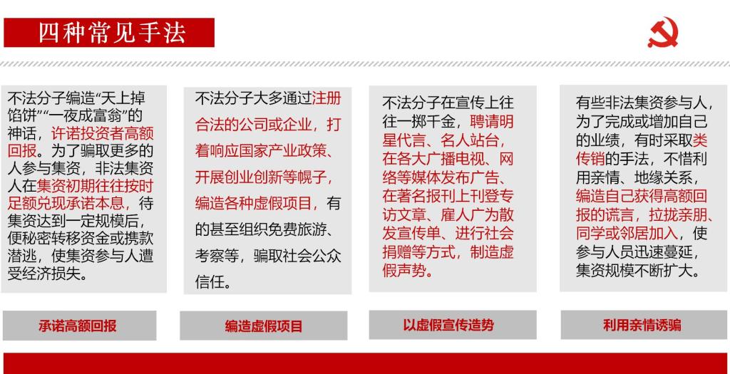 時(shí)刻謹(jǐn)記天上不會(huì)掉餡餅,掉下來(lái)的不是“圈套”就是“陷阱”,不盲目相信所謂的高息“保險(xiǎn)”、高息“理財(cái)”等誘惑。大家要樹(shù)立風(fēng)險(xiǎn)意識(shí),注重信息保護(hù),堅(jiān)守住理性底線,牢記高收益意味著高風(fēng)險(xiǎn),堅(jiān)決對(duì)非法集資說(shuō)“不”!