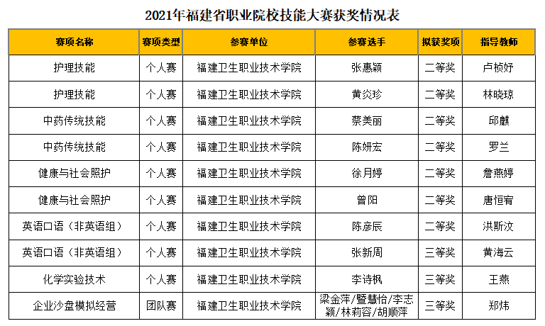 近日,福建省教育廳公布了2021年福建省職業(yè)院校技能大賽獲獎(jiǎng)名單。我校選手奮勇拼搏,斬獲二等獎(jiǎng)7項(xiàng),三等獎(jiǎng)3項(xiàng)的好成績(jī)。其中,護(hù)理技能、中藥傳統(tǒng)技能、健康與社會(huì)照護(hù)、英語(yǔ)口語(yǔ)(非英語(yǔ)組)項(xiàng)目榮獲二等獎(jiǎng);化學(xué)實(shí)驗(yàn)技術(shù)、企業(yè)沙盤模擬經(jīng)營(yíng)和英語(yǔ)口語(yǔ)(非英語(yǔ)組)項(xiàng)目榮獲三等獎(jiǎng)。