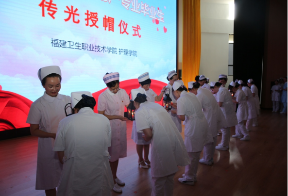 緊接著伴隨著柔美的音樂進(jìn)行神圣的授帽傳光儀式。在護(hù)理學(xué)創(chuàng)始人南丁格爾像前,護(hù)理前輩們?yōu)閱蜗ス蛑漠厴I(yè)生逐一戴上象征著圣潔天使的燕尾帽,畢業(yè)生接過前輩手中象征南丁格爾精神的奉獻(xiàn)之火。白色的燕尾帽在紅色燭光的映襯下,猶如神圣的光環(huán)照耀在每一個現(xiàn)場師生的心中。