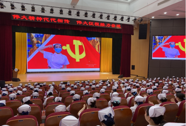 接著,全體畢業(yè)生一同欣賞慶祝中國共產(chǎn)黨成立100周年文藝演出《偉大征程》情景交響歌舞《人民至上》精彩剪輯。一身白衣,一頂燕尾帽,一句誓詞,今天的傳光授帽,傳承的不僅僅是敬佑生命、救死扶傷、甘于奉獻(xiàn)、大愛無疆的南丁格爾精神,更重要的是傳承我們中國護(hù)理人在中國共產(chǎn)黨的領(lǐng)導(dǎo)下,投身偉大戰(zhàn)疫實(shí)踐中所形成的人民至上、生命至上、舍生忘死、不負(fù)重托的精神理念。