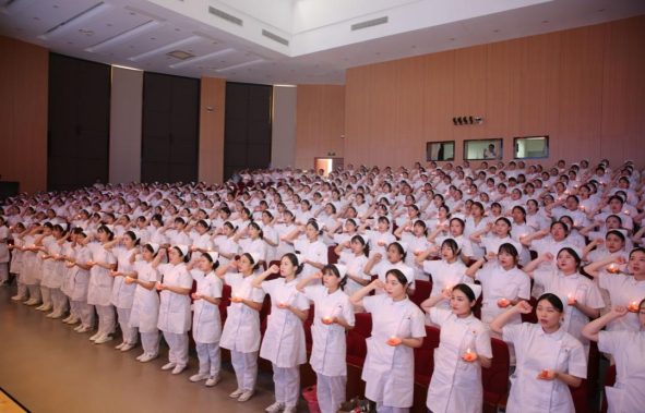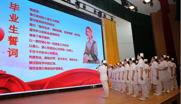 畢業(yè)生們手捧紅燭,舉起右手莊嚴(yán)宣誓:“……熱愛專業(yè),勤勉好學(xué);忠于職守,兢兢業(yè)業(yè);接過前輩手中的紅燭,將畢生精力奉獻(xiàn)給護(hù)理事業(yè)……”鏗鏘有力的聲音久久縈繞在會場上空,昭示著她們正式加入白衣天使的行列。