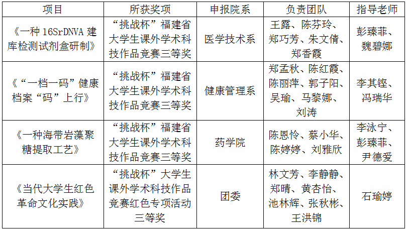 我?!兑环N16SrDNVA建庫檢測試劑盒研制》《“一檔一碼”健康檔案“碼”上行》和《一種海帶巖藻聚糖提取工藝》共三個作品榮獲“挑戰(zhàn)杯”福建省大學生課外學術(shù)科技作品競賽三等獎;《當代大學生紅色革命文化實踐》榮獲“挑戰(zhàn)杯”大學生課外學術(shù)科技作品競賽紅色專項活動三等獎。