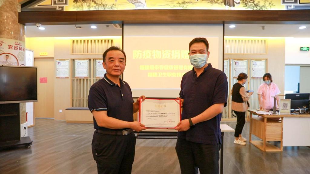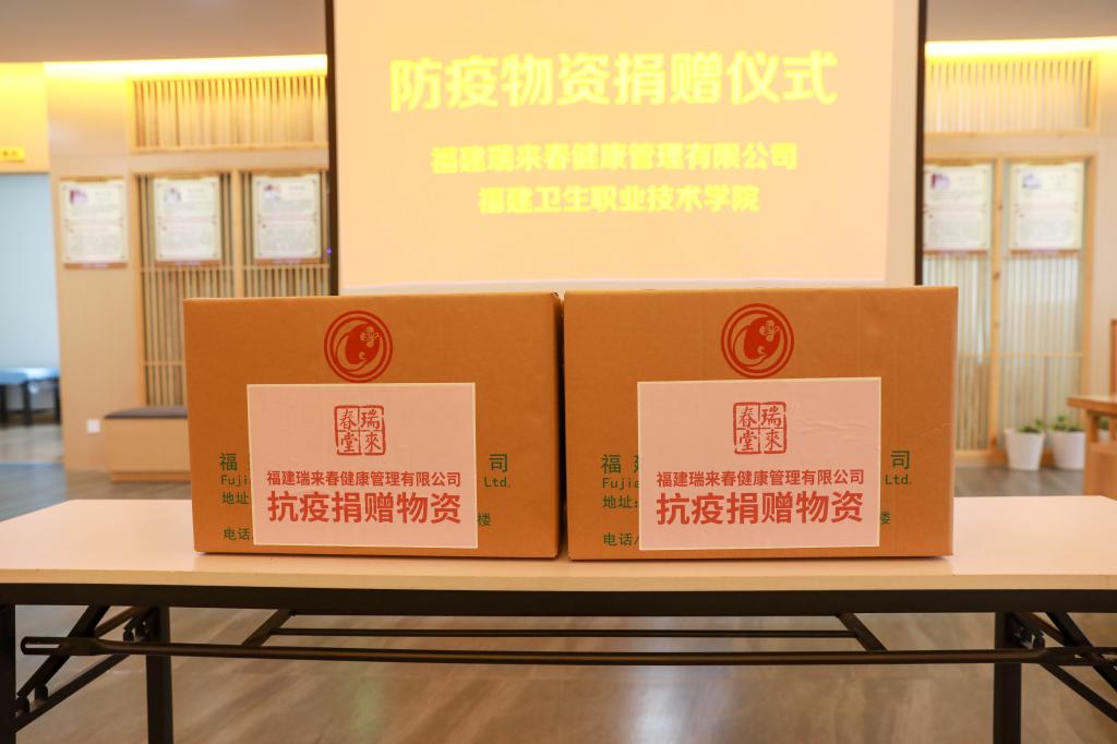 捐贈(zèng)儀式由何舒瀾主持,游鋒代表我校接受福建瑞來春健康管理有限公司捐贈(zèng)的一批防疫物資。