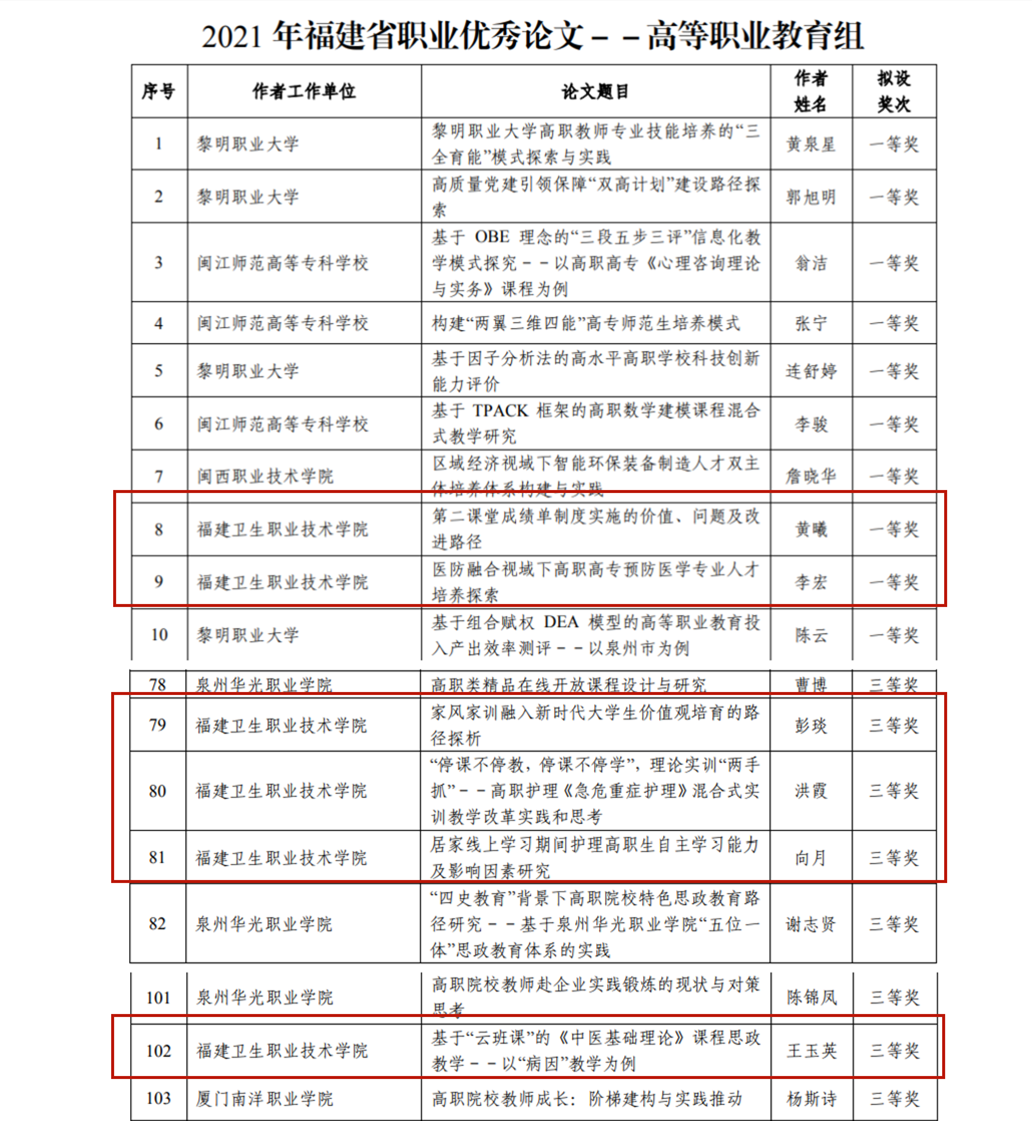 近日,在福建省職業(yè)技術(shù)教育中心組織的2021年福建省職業(yè)教育優(yōu)秀論文征集評選活動中,我校有6篇論文獲獎。黃曦老師的《第二課堂成績單制度實施的價值、問題及改進路徑》、李宏老師的《醫(yī)防融合視域下高職高專預防醫(yī)學專業(yè)人才培養(yǎng)探索》榮獲一等獎;彭琰老師的《家風家訓融入新時代大學生價值觀培育的路徑探析》、洪霞老師的《“停課不停教,停課不停學”,理論實訓“兩手抓”--高職護理<急危重癥護理>混合式實訓教學改革實踐和思考》、向月老師的《居家線上學習期間護理高職生自主學習能力及影響因素研究》、王玉英老師的《基于“云班課”的<中醫(yī)基礎(chǔ)理論>課程思政教學--以“病因”教學為例》榮獲三等獎。