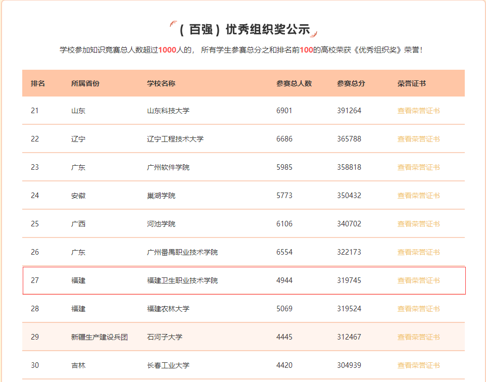 據(jù)悉,本次競(jìng)賽所用試卷由“學(xué)習(xí)強(qiáng)國(guó)”上海學(xué)習(xí)平臺(tái)提供,共吸引了廈門大學(xué)、暨南大學(xué)、石河子大學(xué)、廣州大學(xué)等全國(guó)848所高校54.6萬學(xué)生參賽。我校約5000名學(xué)生參與競(jìng)賽,近4000名完成學(xué)習(xí)、競(jìng)賽任務(wù),獲得《電子學(xué)習(xí)證書》,位列全國(guó)第27名、全省高校第3名、全省高職院校第1名。