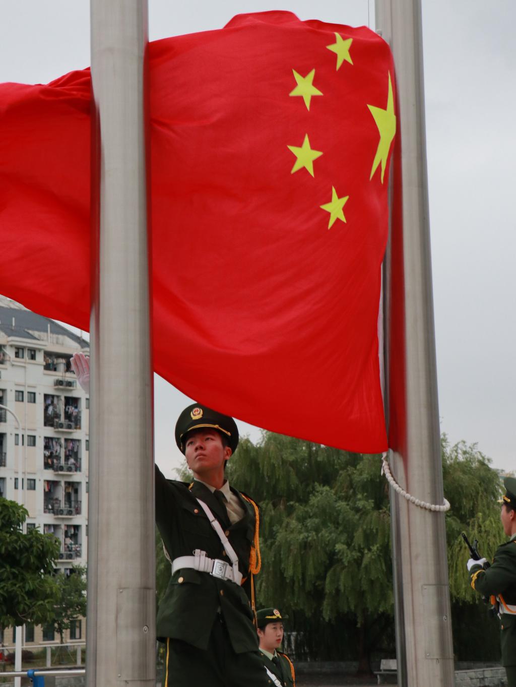 隨著國旗護(hù)衛(wèi)隊矯健有力的步伐,雄壯的國歌聲響起,典禮正式拉開序幕。向著秋雨洗禮過后的清空,五星紅旗冉冉升起,全體師生向國旗敬禮。