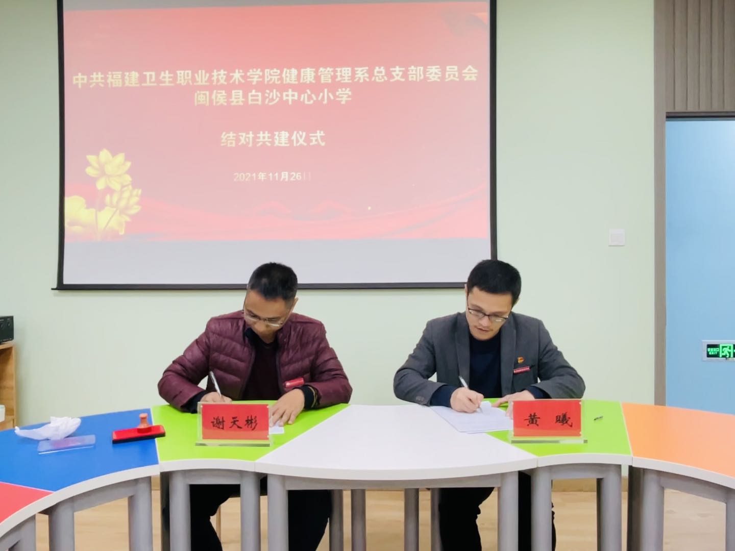 為持續(xù)深入開展黨史學(xué)習(xí)教育,做到學(xué)史力行,強(qiáng)化“我為群眾辦實(shí)事”成效,11月26日,健康管理系黨總支與閩侯縣白沙中心小學(xué)在學(xué)生服務(wù)中心舉行共建協(xié)議續(xù)簽儀式。健康管理系黨總支書記黃曦、副書記吳燕玲、2個學(xué)生支部書記,閩侯縣白沙小學(xué)學(xué)區(qū)校長謝天彬、副校長陳由禪等參與會議。