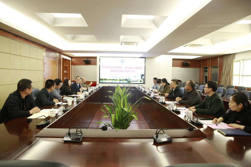 12月10日下午,明溪縣人民政府副縣長(zhǎng)王鳳珍(國(guó)家中醫(yī)藥管理局掛職干部)帶領(lǐng)明溪縣衛(wèi)生健康局、教育局、總醫(yī)院、職業(yè)中學(xué)等相關(guān)負(fù)責(zé)人一行來(lái)訪我校,省衛(wèi)健委監(jiān)督處陳繼清處長(zhǎng)一同調(diào)研考察。我校黨委書記曾武祈、校長(zhǎng)許能鋒、副校長(zhǎng)鄭翠紅在行政樓四樓會(huì)議室接待客人并舉行座談,黨政辦公室、教務(wù)處以及相關(guān)院系負(fù)責(zé)人參加座談會(huì)。