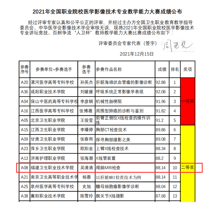 12月15日,由全國衛(wèi)生職業(yè)教育教學指導委員會、中華醫(yī)學會影像技術分會主辦的2021年全國職業(yè)院校醫(yī)學影像技術專業(yè)教學能力大賽總成績公布,我校醫(yī)學技術系吳清清老師的參賽作品《顱腦MRI檢查》榮獲二等獎。
