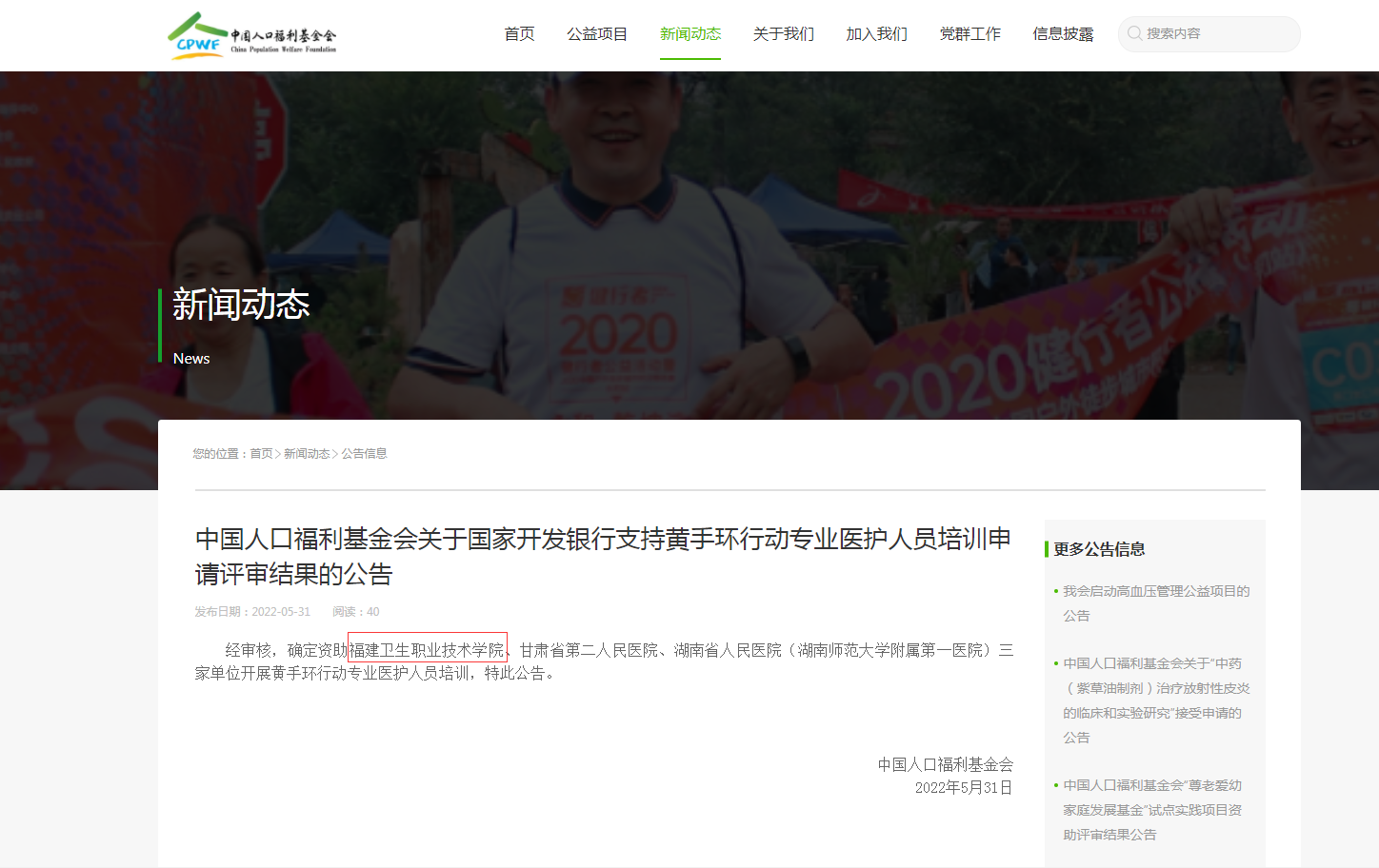 2022年5月31日,中國人口福利基金會(huì)公布關(guān)于國家開發(fā)銀行支持黃手環(huán)行動(dòng)專業(yè)醫(yī)護(hù)人員培訓(xùn)評(píng)審結(jié)果,我校獲批開展黃手環(huán)行動(dòng)專業(yè)醫(yī)護(hù)人員培訓(xùn),全國僅三家單位獲此資格。