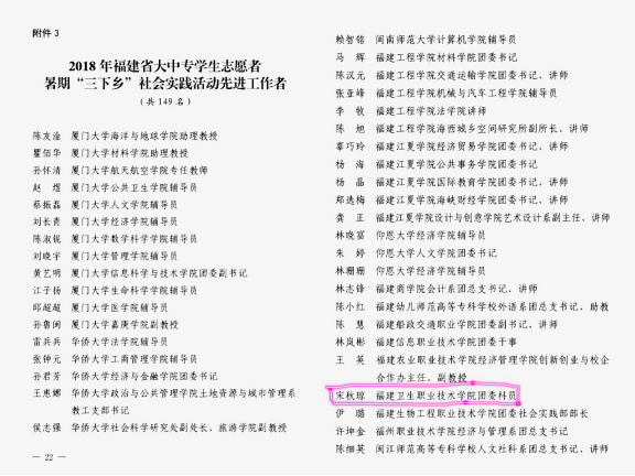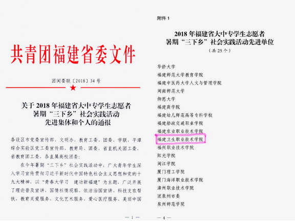 近日,中共福建省委宣傳部、中國福建省委文明辦、中國福建省委教育工委、共青團(tuán)福建省委、福建省學(xué)生聯(lián)合會聯(lián)合下發(fā)《關(guān)于2018年福建省大中專學(xué)生志愿者暑期“三下鄉(xiāng)”社會實踐活動先進(jìn)集體和先進(jìn)個人的通報》(團(tuán)閩委聯(lián)〔2018〕34號),我院榮獲福建省“三下鄉(xiāng)”社會實踐先進(jìn)單位,藥學(xué)系炫藥青春隊獲福建省“三下鄉(xiāng)”社會實踐優(yōu)秀團(tuán)隊,團(tuán)委宋秋瓊老師獲福建省“三下鄉(xiāng)”社會實踐先進(jìn)工作者,管理系李沅慧同學(xué)獲福建省“三下鄉(xiāng)”先進(jìn)個人。