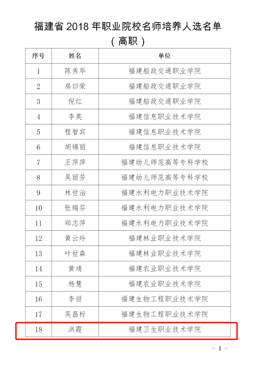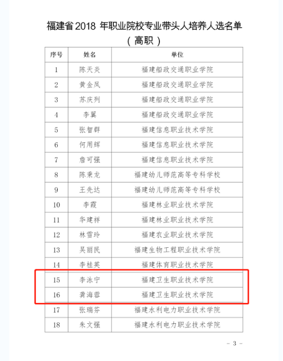 近日,省教育廳公布了職業(yè)院校名師名校長(zhǎng)和專業(yè)帶頭人培養(yǎng)人選名單。我院護(hù)理系龔海蓉、藥學(xué)系李泳寧2位教師被確定為省職業(yè)院校專業(yè)帶頭人培養(yǎng)人選,護(hù)理系教師洪霞被確定為省職業(yè)院校教師名師培養(yǎng)人選。
