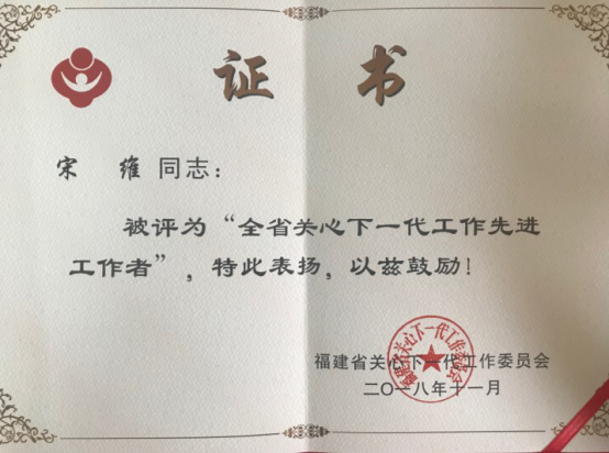 另訊,在日前召開的福建省關(guān)心下一代工作委員會成立30周年座談會上,通報表揚了全省關(guān)心下一代工作先進集體和先進個人,我院關(guān)工委秘書長宋維被評選為“全省關(guān)心下一代工作先進工作者”。